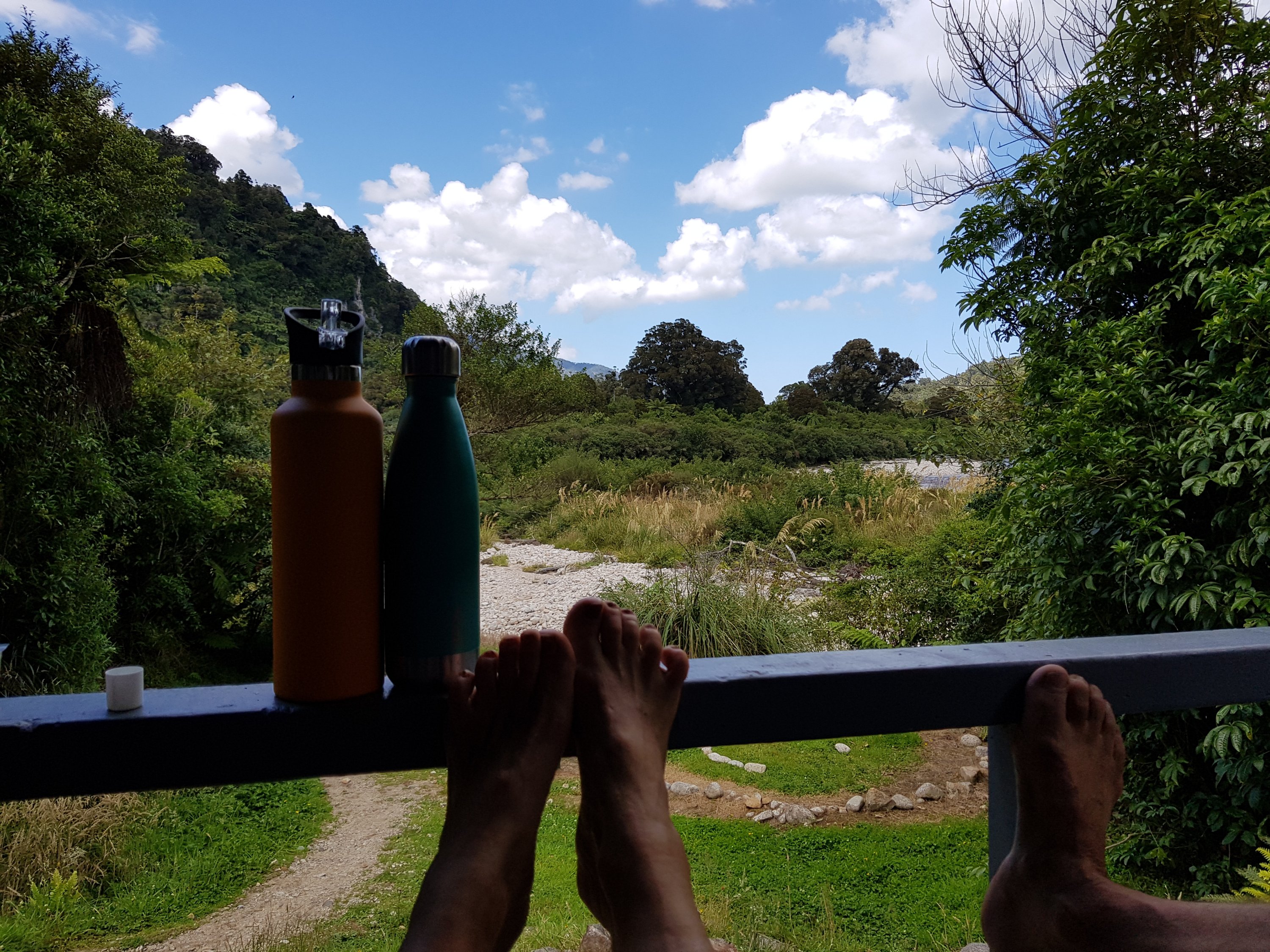 am Ende des langen Wandertages belohnt die Hütte mit outdoor-spa (= kalter bach) und grandiosem Ausblick auf unser nächstes Ziel: die Mündung des Heaphyriver.