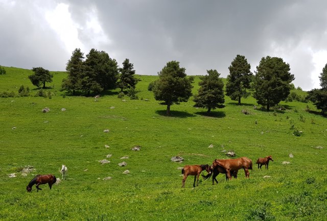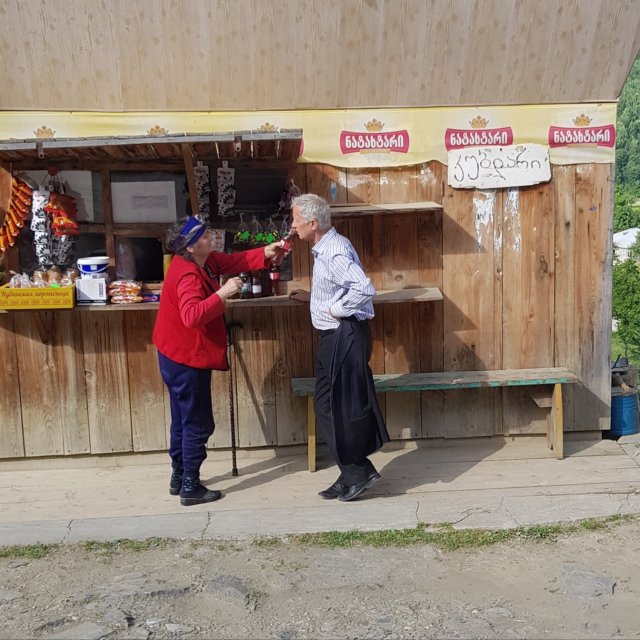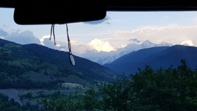 in die Berge der endlich etwas Erfrischung verspricht. Nicht nur dass die Strecke genügend Kurven hätte, erfordern zahlreiche Schlaglöcher und die obligatorischen Kühe auf der Strasse für eine bewegte Fahrt. Aber nach der georgischen zwanzigminütigen Pause, die etwa eine Stunde gedauert hat, war die Fahrweise unseres Fahrers nochmals deutlich beschwingter, die ganze Strassenbreite wurde genutzt zusätzlich zu zahlreichen energischen Telefonate. Hätte Daniel mal das Angebot zum gemeinsamen Schnapstrinken nicht abgelehnt, dann wäre vielleicht etwas weniger für den Fahrer übrig geblieben?